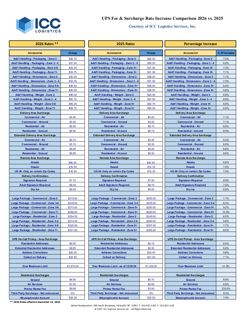 UPS Fee & Surcharge Rates 2026 vs 2025 Chart