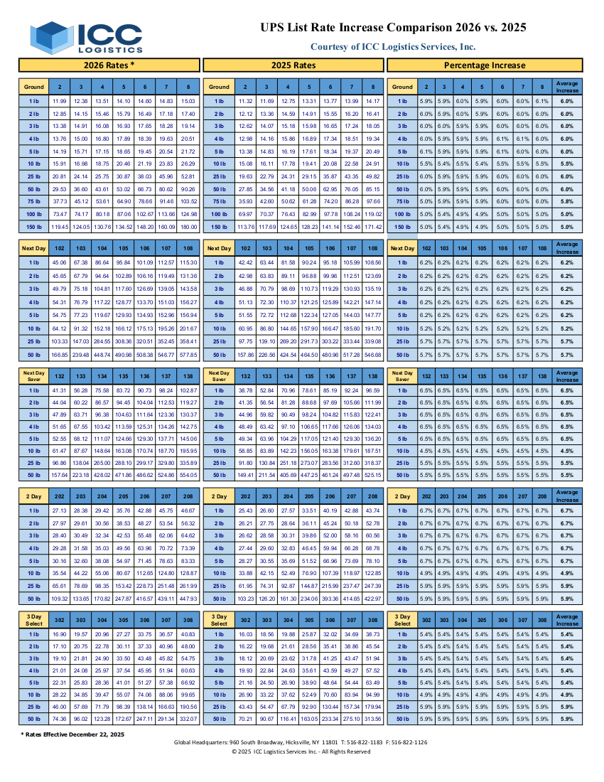 UPS List Rates 2026 vs 2025 Chart